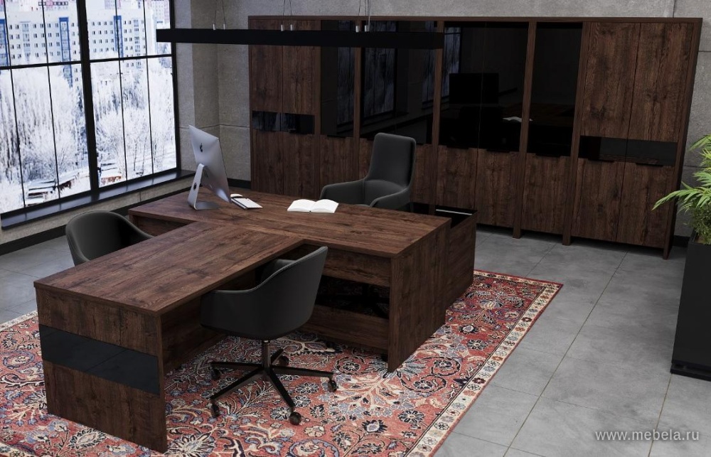 Комплект для кабинетов “Акцент” в цвете дуб апрель полностью оправдывает свое название. Его дизайн построен на контрасте цветов и материалов. Комбинирование ДСП и тонированного стекла создает неповторимый образ в вашем офисе, обладая при этом высочайшей функциональностью.