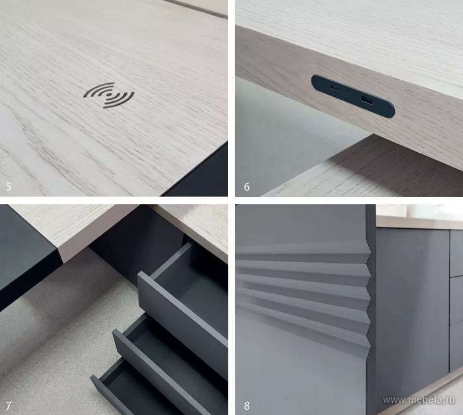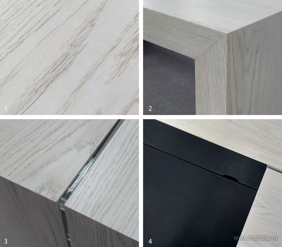 Мебель выполнена из плит МДФ, облицованных шпоном или термопластичной ПВХ-пленкой, и из ЛДСП. Мебель выпускается в трех цветовых вариантах шпона: «дуб Фрост», «дуб Шале» и «дуб Оул». Декоративная облицовка элементов — матовая ПВХ-пленка цвета «графит», детали из ЛДСП выполняются в цвете «антрац...