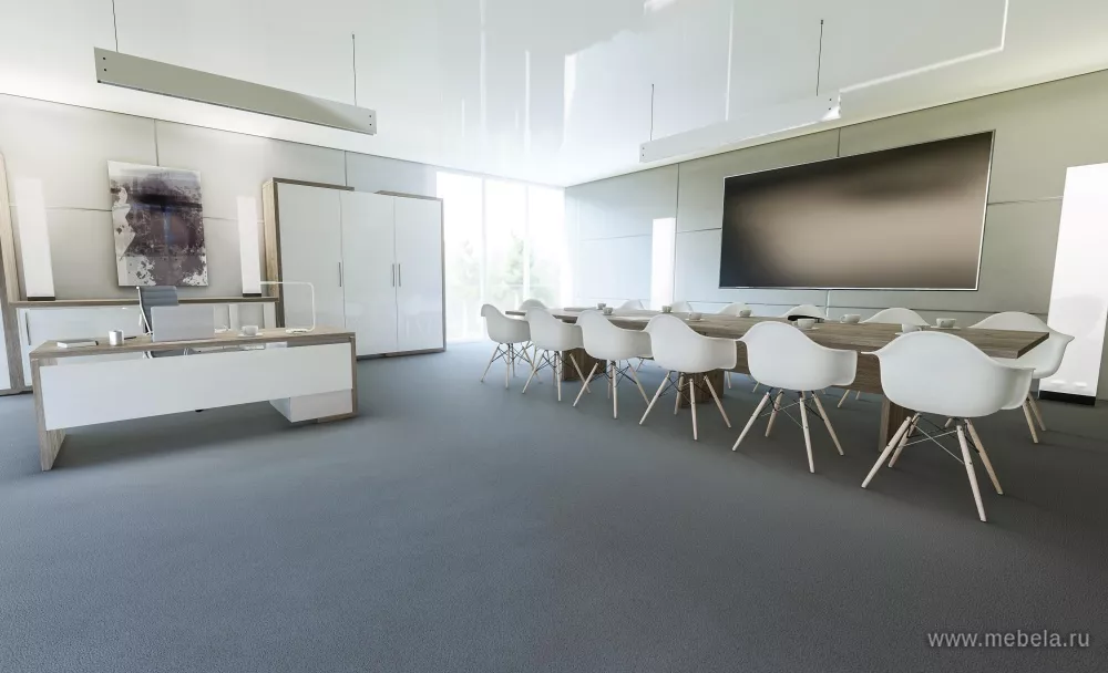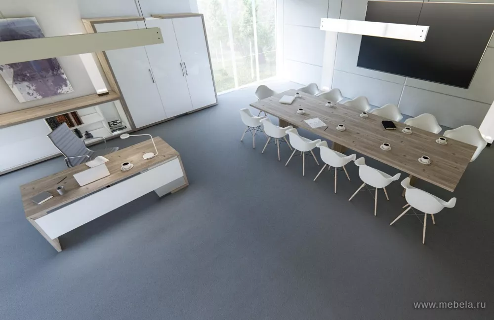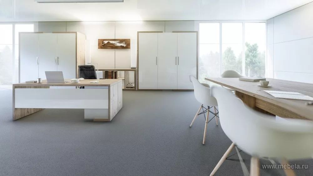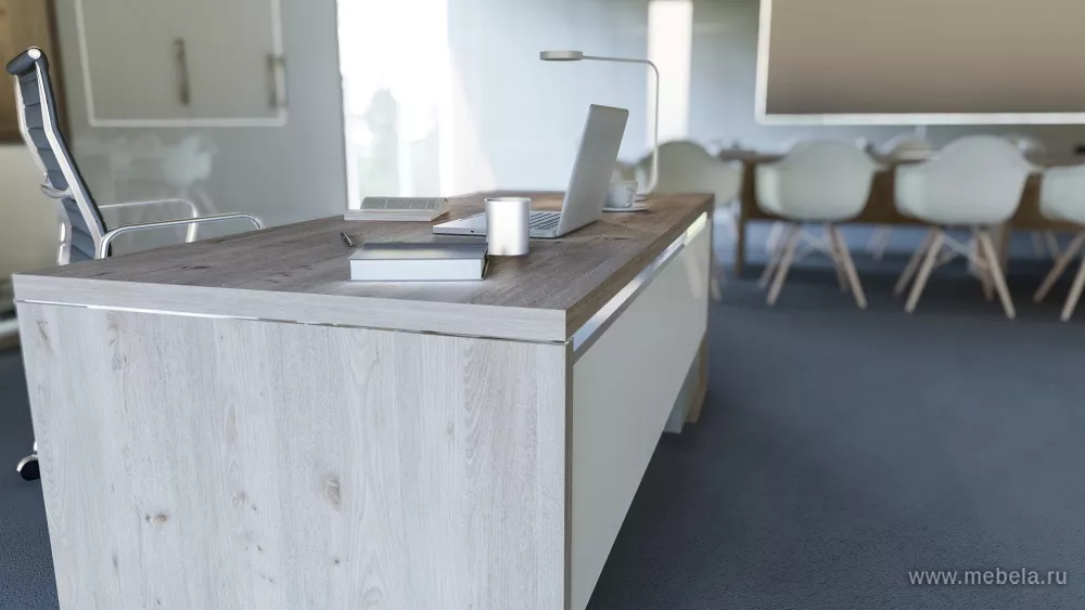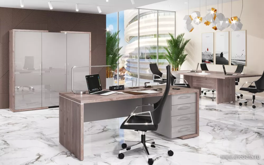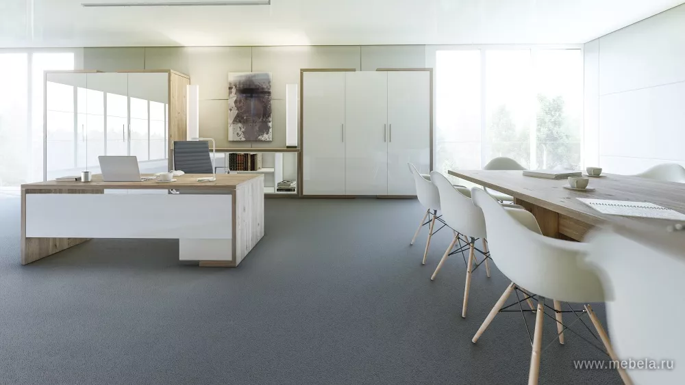 Коллекция офисной мебели для кабинета руководителя Asti выполнена в самых трендовых цветах и сочетаниях оттенков: медно-золотистый дуб Сантана с белым глянцем и благородный дуб Нельсон, подчеркнутый глянцевым серым. Кабинет воплощает в себе философию разумной организации современного рабочего пространства.