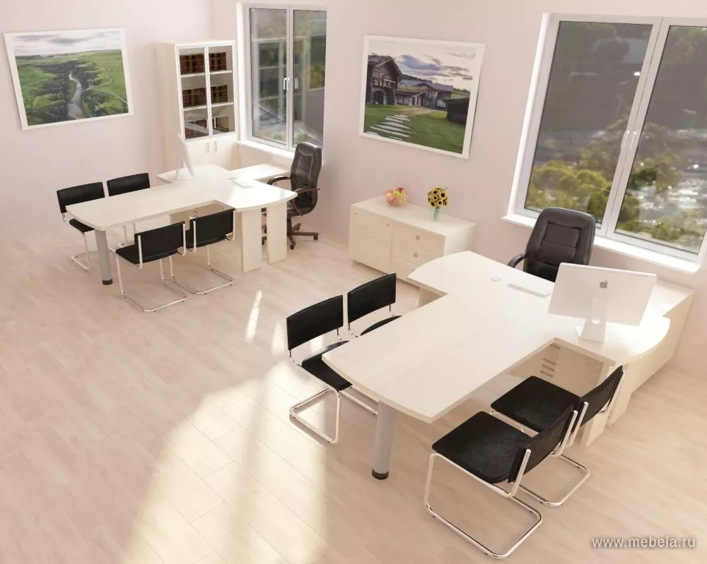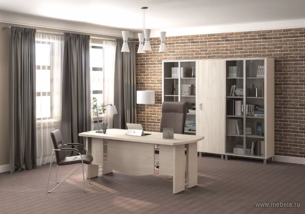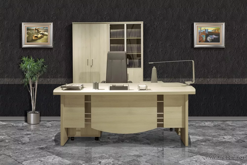Кабинет руководителя Born White - безупречная эстетика всех элементов модельного ряда, функциональность, практичность и высокий уровень комфорта для оптимальной продуктивности в работе. Светлый оттенок мебели, матовый хром ручек, изящные контуры подстолья с декором создают стильный современный интерьер.