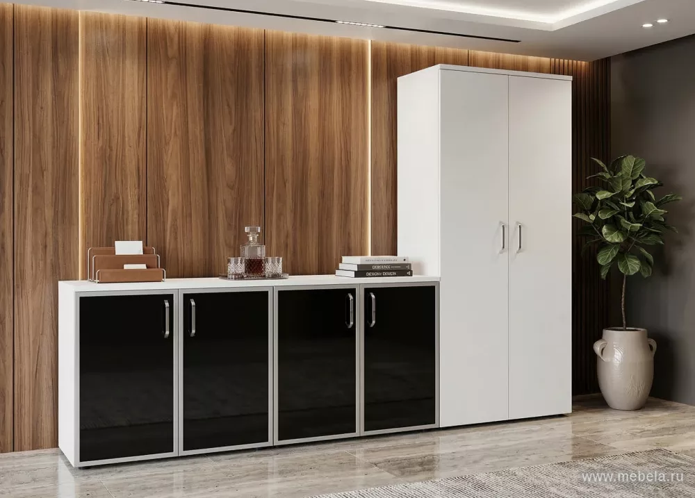 Офисный шкаф низкий узкий лев./прав. (1 низкий фасад чёрное стекло в раме)