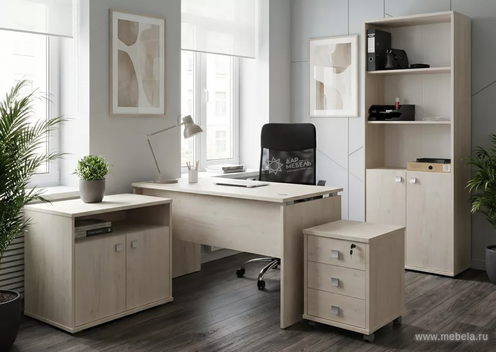 Офисная мебель для персонала Style Dub Navarre Российская мебель для рабочих мест, изготовленная из ЛДСП «Kronospan»: 22 мм для столешниц, каркасов тумб, приставок и стеллажей, и 18 мм для фасадов шкафов и тумб. Конструкция прочная, аккуратная, исполнение в цвете дуб наварра.