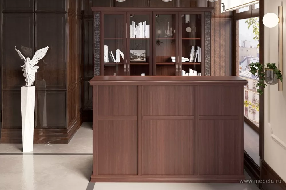 Нет лучшего способа подчеркнуть высокий статус компании, чем оформить ее приемную в классических элементах интерьера. С этой задачей прекрасно справляются стойки ресепшн “Порто”, выполненные в изящных и солидных формах с использованием цвета дуб кофейный и орех классик.