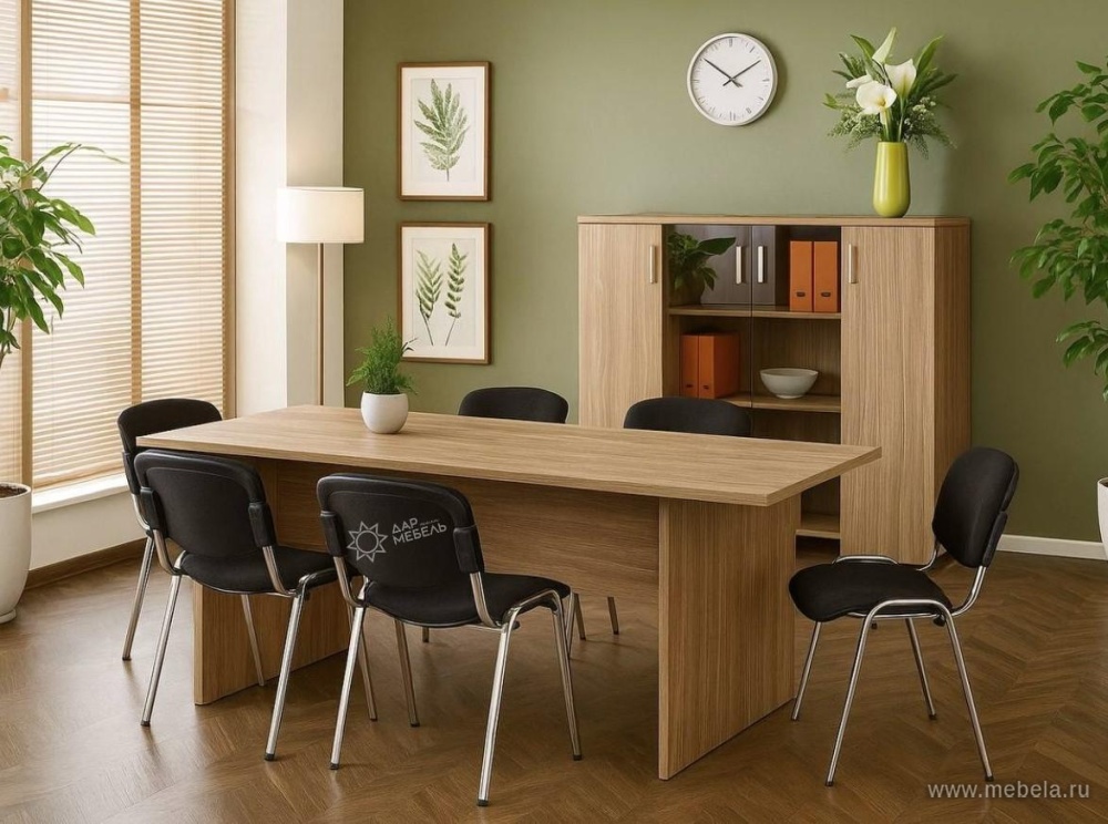 Несмотря на свою классическую геометрию, столы для переговоров “Аргентум” обладают своим уникальным стилем. Он выражается в яркости проработки древесной фактуры на ЛДСП-панелях. Благодаря такому подходу создается полная иллюзия натурального массива при экономической доступности столов.