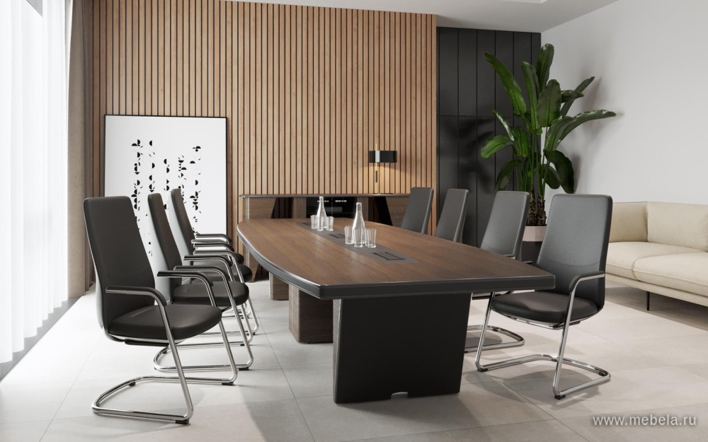 Потрясающий по внешнему виду и качеству материалов стол New.Tone станет отличной презентацией зала переговоров, солидного имиджа и успешности компании. Современный лаконичный стиль модели подчеркнут благородными материалами - причудливыми древесными текстурами природного дуба, кожаной вставкой и металлом.
