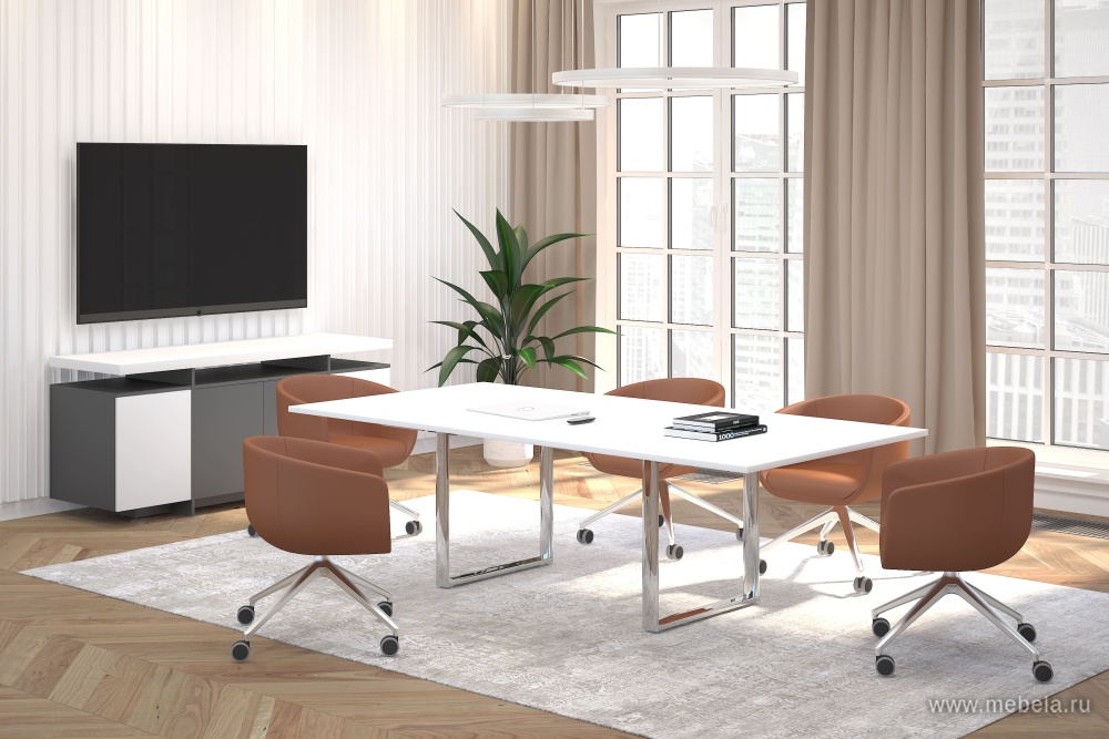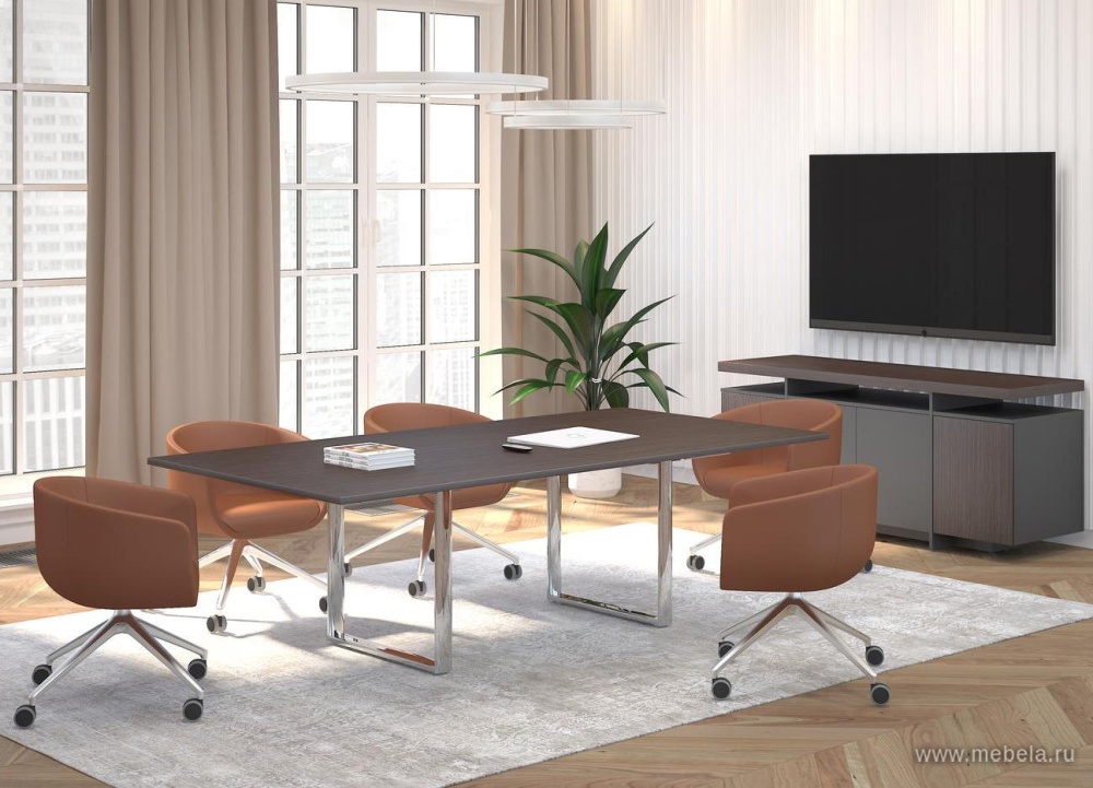 Роскошь в Хай-Тек стиле – так можно охарактеризовать столы для переговоров Orbis, Carre. Идеальная полированная поверхность столешниц из ламинированного ДСП или закаленного стекла создает высокотехнологичный образ в сочетании с хромированными П-образными опорами.