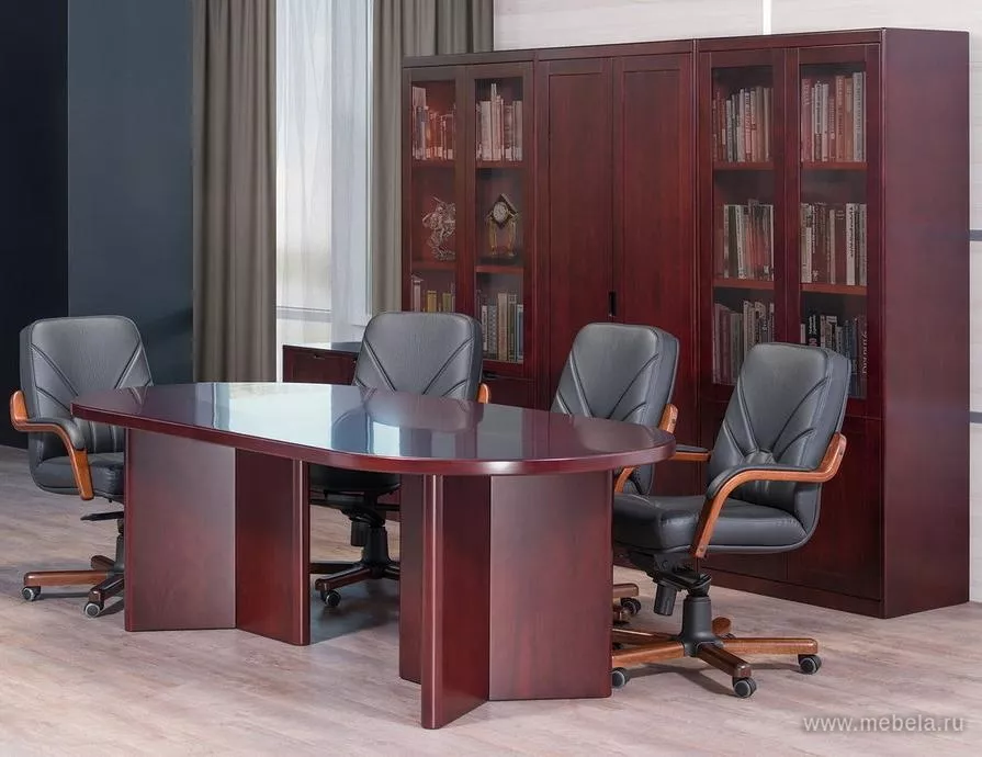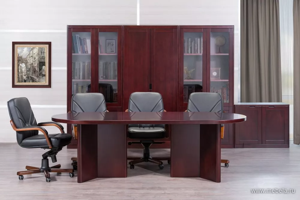 Элегантная модель, представленная в двух классических офисных оттенках: темный орех и палисандр. Оба варианта гармонично сочетаются с мебель светлого и темного цвета. Гладкая, отполированная поверхность стола подчеркивает солидность компании.