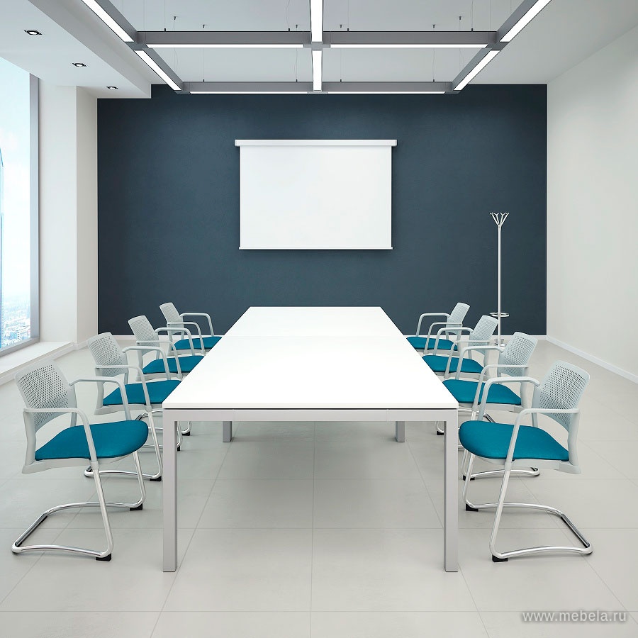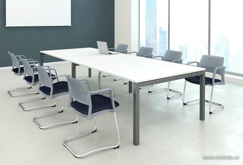 Простой стол прямой формы без лишних деталей и декора. Лишь стильные металлические ножки и столешница в белом, ореховом цвете или модном оттенке акация аури. Такой дизайн не отвлекает участников совещаний, переговоров и обсуждений от ключевого вопроса. Стол позволяет расположить на нем чертежи, проекты, документы.