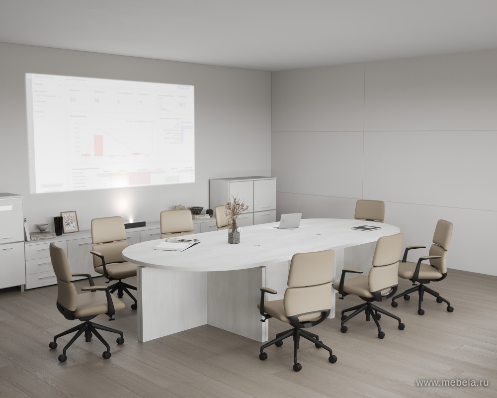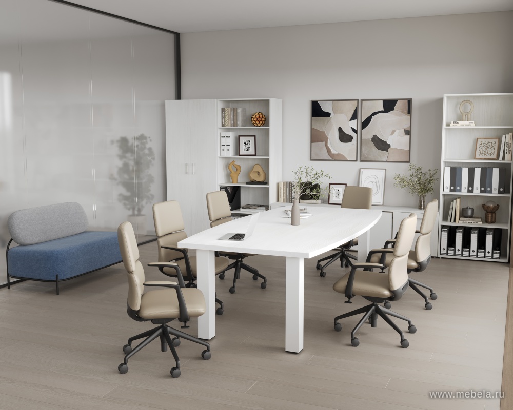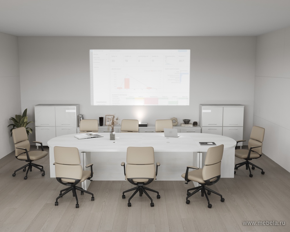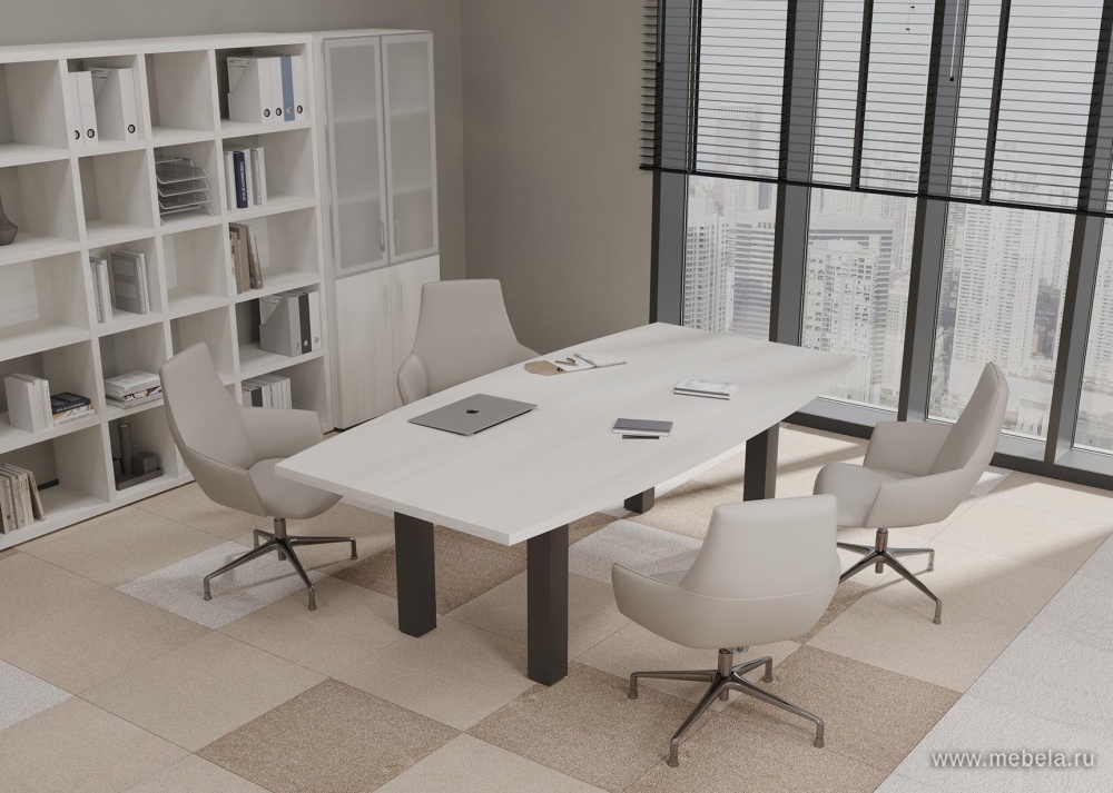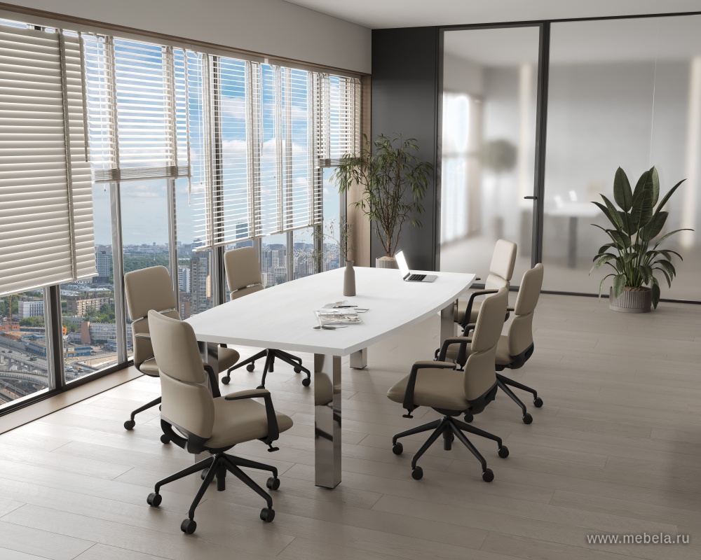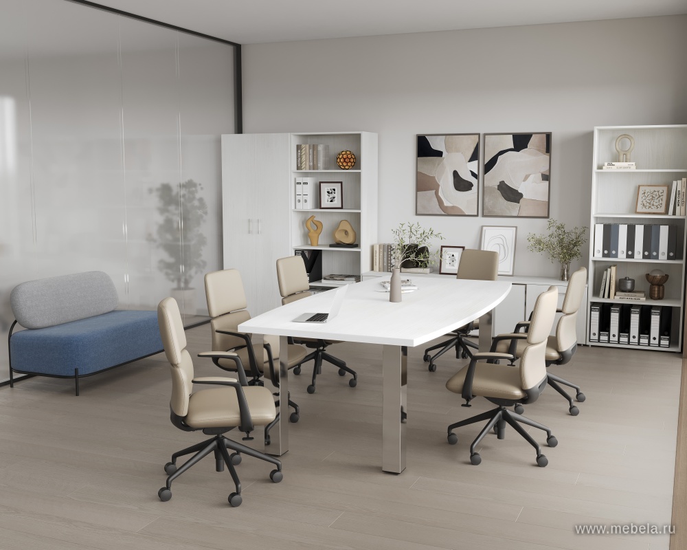 Коллекции столов для переговоров Yalta White в цвете снежная патина удалось совместить солидный и монументальный стиль с невероятной визуальной легкостью. Последний эффект достигается за счет белого цвета их ламинированных панелей, за счет которого пространство даже в небольшом офисе зрительно расширяется.