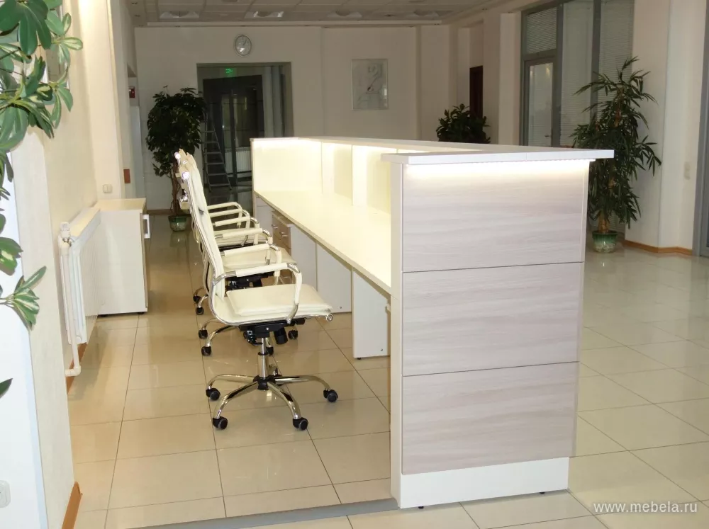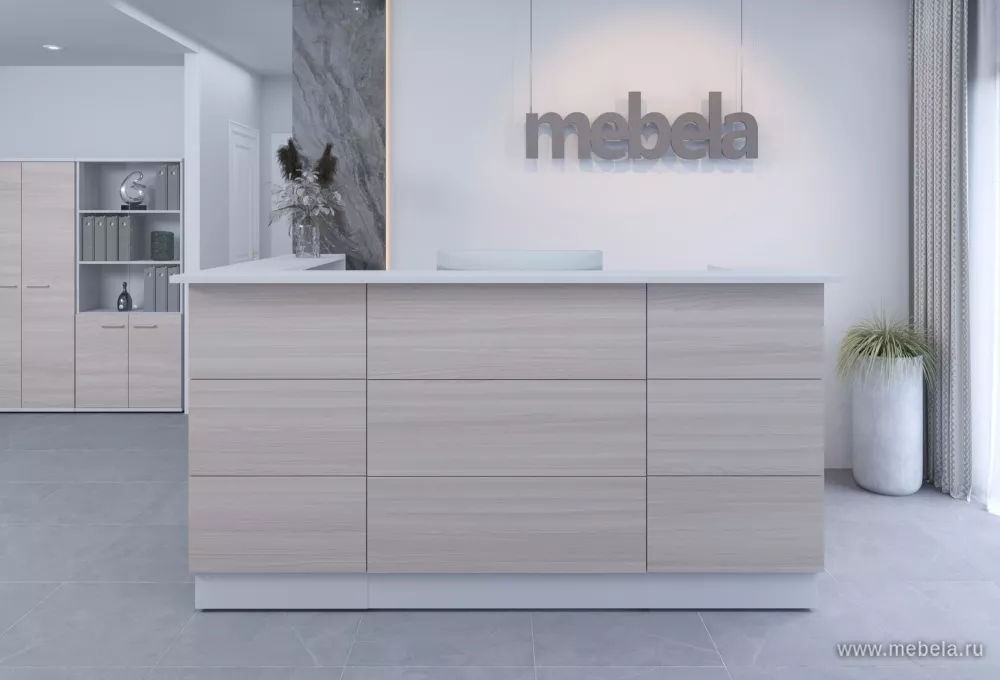 Лаконичная стойка ресепшн Steel прямоугольной формы без лишнего декора и деталей. Представлена в цвете светлый дуб. Верхняя поверхность лакирована, что придает модели современный вид. С внутренней стороны оборудовано рабочее место для нескольких сотрудников. Подсветка не входит в комплект.